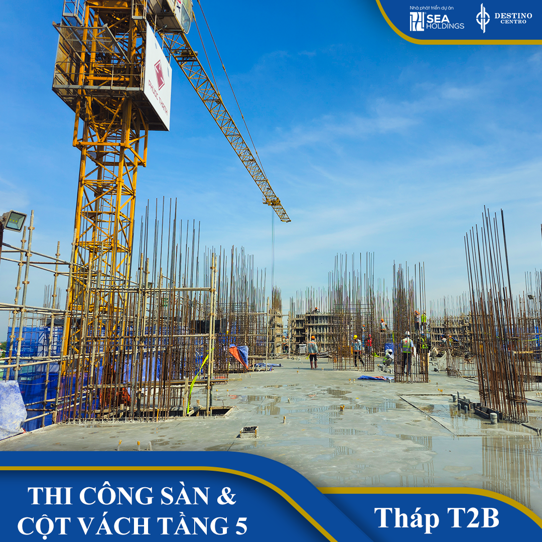 Bám sát tiến độ chung, tháp T2B đang ghi nhận những bước tiến vững chắc trên công trường. Hiện tại, tháp đang tiến hành thi công sàn và cột vách tầng 5.